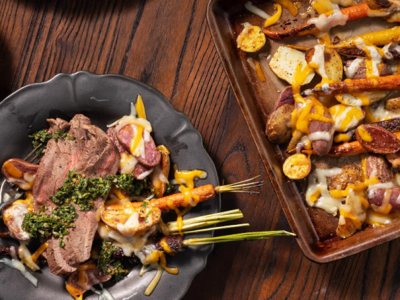 One-pan roasted flank steak with fingerling potatoes and carrots, topped with melted Mexican cheese blend. Served with vibrant carrot top chimichurri made from garlic, red pepper, oregano, and red wine vinegar. The chimichurri transforms vegetable scraps into a bold, herbaceous condiment that enhances the entire dish.