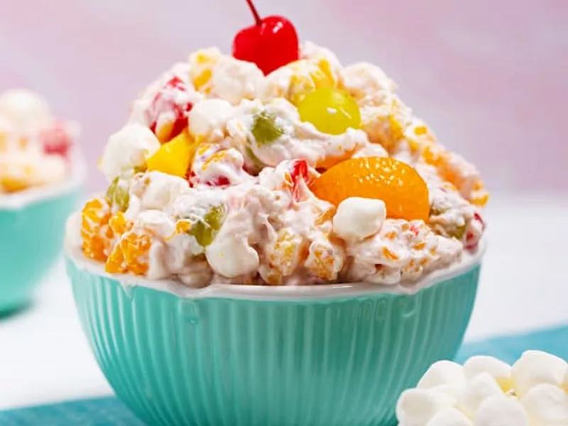Retro fruit salad combining canned mandarin oranges, pineapple, maraschino cherries, and fresh grapes with marshmallows, coconut, and walnuts folded into whipped cream and sour cream. A nostalgic dessert that chills for hours to meld flavors and soften the marshmallows.