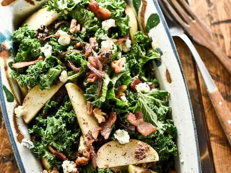 A hearty kale salad that transforms sturdy greens into a satisfying meal with crispy bacon, caramelized red onions, and tangy blue cheese. The warm bacon fat helps wilt the kale slightly while the honey balsamic dressing balances rich and sweet flavors. Toasted walnuts and fresh Fuji apple add crunch and brightness. Perfect for a substantial lunch or dinner side that feels both healthy and indulgent.