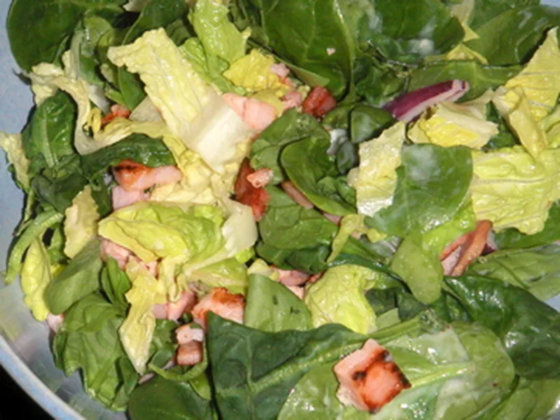 A classic wilted salad combining crisp spinach and iceberg lettuce with a warm, savory bacon vinaigrette thickened with cornstarch and egg. The hot dressing slightly softens the greens while maintaining their structure. Serve as a side dish or light lunch, best eaten immediately while the dressing is warm. This version uses a traditional warm-salad approach, distinct from cold vinaigrettes.