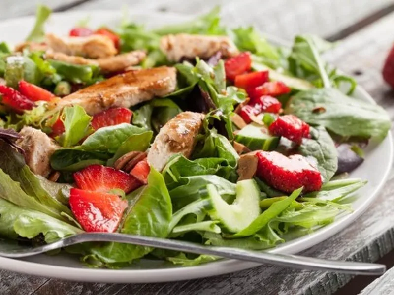 A vibrant warm salad combining tender cubed chicken with fresh baby spinach, sweet strawberries, and toasted almonds in a bright lemon vinaigrette. The contrast between warm chicken and cool greens creates appealing textural variety, while lemon pepper seasoning brings savory depth to lean protein. Strawberries add natural sweetness and juicy bursts that balance the lemony dressing. This dish suits weeknight dinners, light lunches, and meal prep for those seeking satisfying yet nutritious options. Unlike traditional cold salads, the warm chicken slightly wilts the spinach while maintaining its nutritional integrity, creating a more cohesive, restaurant-quality bowl. The toasted almonds provide crucial crunch and richness. It comes together in under 20 minutes, making it ideal for busy schedules. Perfect served immediately while the chicken retains warmth, or enjoyed at room temperature the next day.