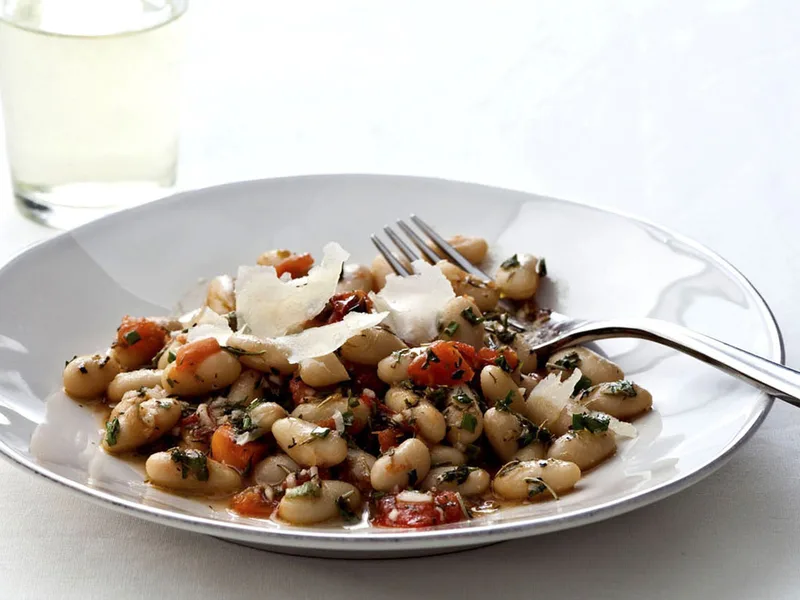 A bright, herbaceous white bean salad finished with a zesty lemon vinaigrette and finished with Parmesan. Warm white beans and tomatoes are tossed with a whisked dressing of olive oil, lemon juice, fresh chives, and Mediterranean herbs including thyme and rosemary. Serve as a side dish alongside grilled chicken or fish, or as a light main course for lunch. The combination of fresh herbs and citrus makes this a refreshing option for warm-weather meals.