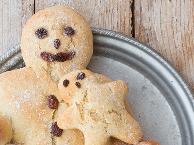 Traditional German vegan spelt figures featuring whole grain and sweet spelt flours bound with coconut oil, maple syrup, and plant milk. Fresh yeast creates a tender crumb decorated with raisins and powdered sugar. Baked until golden at 180°C, these festive treats are best enjoyed warm or stored overnight for next-day enjoyment.
