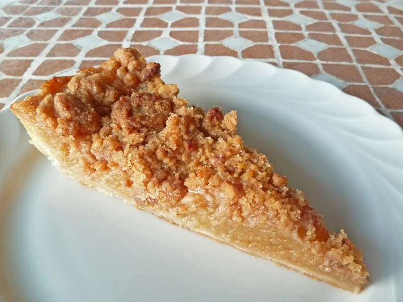 Single-crust pie with sautéed tart apples folded with whiskey and warm spices, topped with a buttery pecan-flour crumble. The crust is blind-baked until barely golden, then filled and baked at high temperature before lowering heat to allow the crumble topping to brown while filling bubbles at the edges.