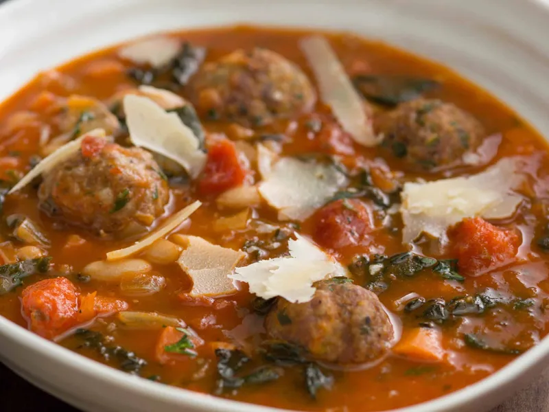 Hearty Italian-style soup combining homemade sausage meatballs with cannellini beans, Tuscan kale, and marinara sauce. Vegetables are sautéed until tender, then simmered with mashed and whole beans for body and texture. Finished with fresh parsley and shaved Parmesan.