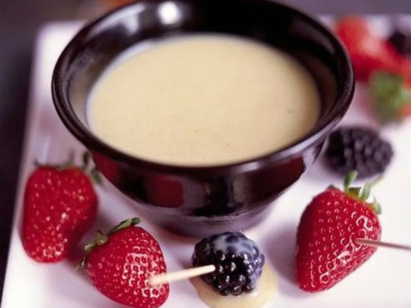 Silky white chocolate fondue made with butter and double cream, infused with vanilla. Serve warm with chilled mixed berries for dipping. A simple yet elegant dessert that combines melted chocolate richness with fresh fruit acidity.