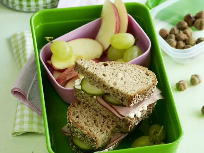 Pack fruit and nuts separately from the assembled sandwich to prevent moisture transfer. Use rigid containers with secure lids to maintain sandwich structure during transit.