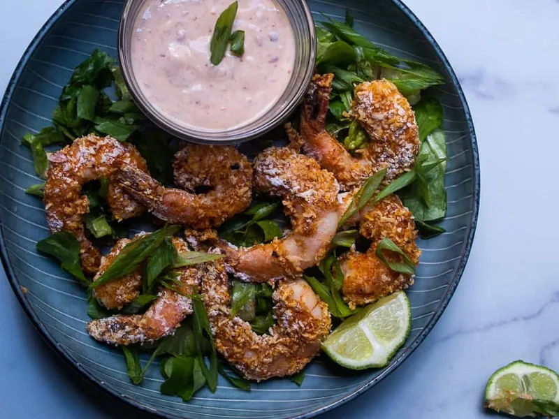 Crispy air-fried shrimp coated in almond flour and unsweetened coconut, served with a spiced Greek yogurt dipping sauce spiked with lime and Sambal Oelek. Ready in under 20 minutes. Whole30-compliant when using coconut cream and compliant ranch as sauce alternative.