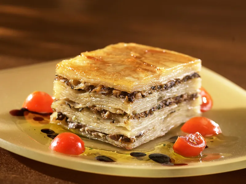 Wild Mushroom Idaho Potato Pave with Tomato Coulis