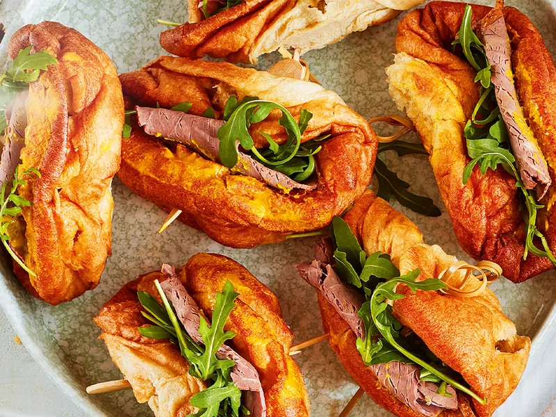 A creative fusion dish that reimagines the classic Yorkshire pudding as a handheld wrap, filled with British cooked beef, peppery rocket, and tangy English mustard. The crispy, puffy exterior of the Yorkshire pudding provides structure and textural contrast to the tender beef filling, while the mustard adds a sharp, savory kick. This playful recipe works for casual weeknight dinners, packed lunches, or entertaining guests who appreciate inventive takes on traditional comfort food. The batter-based shell bakes until golden and well-risen, then flattens slightly to cradle the filling. What sets this version apart is its transformation of individual Yorkshire puddings from a side dish into the main event, combining British ingredients in an unexpected format that's both fun to make and eat.