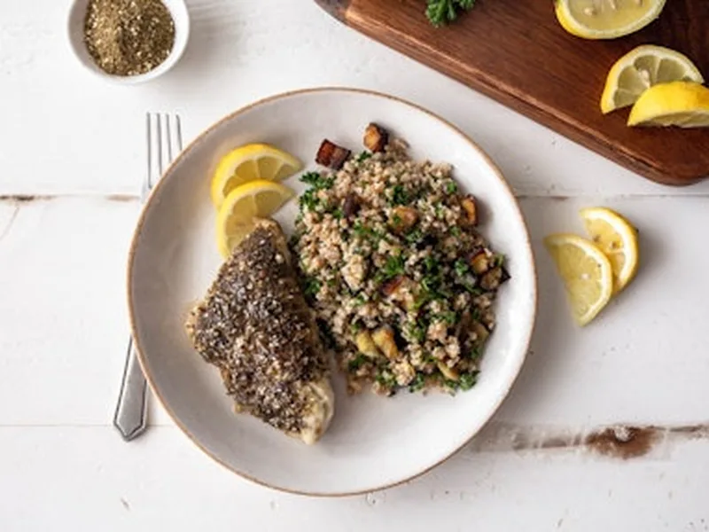 This Mediterranean-inspired dish combines flaky white fish seasoned with aromatic za'atar spice blend alongside a warm bulgur salad studded with roasted eggplant, fresh herbs, and crunchy pistachios. The fish and eggplant roast together on one pan, making cleanup easy while the vegetables caramelize beautifully. Perfect for a weeknight dinner that feels special, this recipe balances earthy za'atar flavors with bright lemon and fresh mint. The bulgur salad can be served warm or at room temperature, making it versatile for entertaining or meal prep.