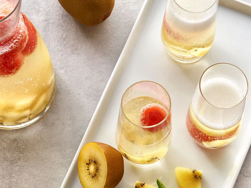 A bright, celebratory punch that pairs tropical Zespri SunGold kiwis with watermelon and prosecco for an effortless sparkling drink. The golden kiwis bring natural sweetness and subtle tartness while the melon adds refreshing juiciness and the bubbles provide festive lift. What sets this version apart is the use of premium SunGold kiwis, which are naturally sweeter and less tart than green varieties, eliminating the need for additional sugar or citrus. The fruit infuses the wine gently without overpowering it. Perfect for warm-weather entertaining, brunches, or summer gatherings, this punch comes together in minutes and impresses with minimal effort. The combination of flavors and textures creates something sophisticated yet approachable, making it ideal for both casual poolside afternoons and more formal occasions.