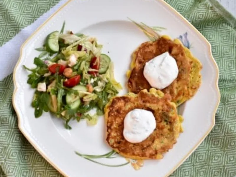 Pan-fried zucchini pancakes bound with eggs and chickpea flour, studded with crumbled feta and fresh mint. Moisture is removed from shredded zucchini before mixing with a simple batter, creating golden-brown, tender pancakes that work as an appetizer, side dish, or light main course.